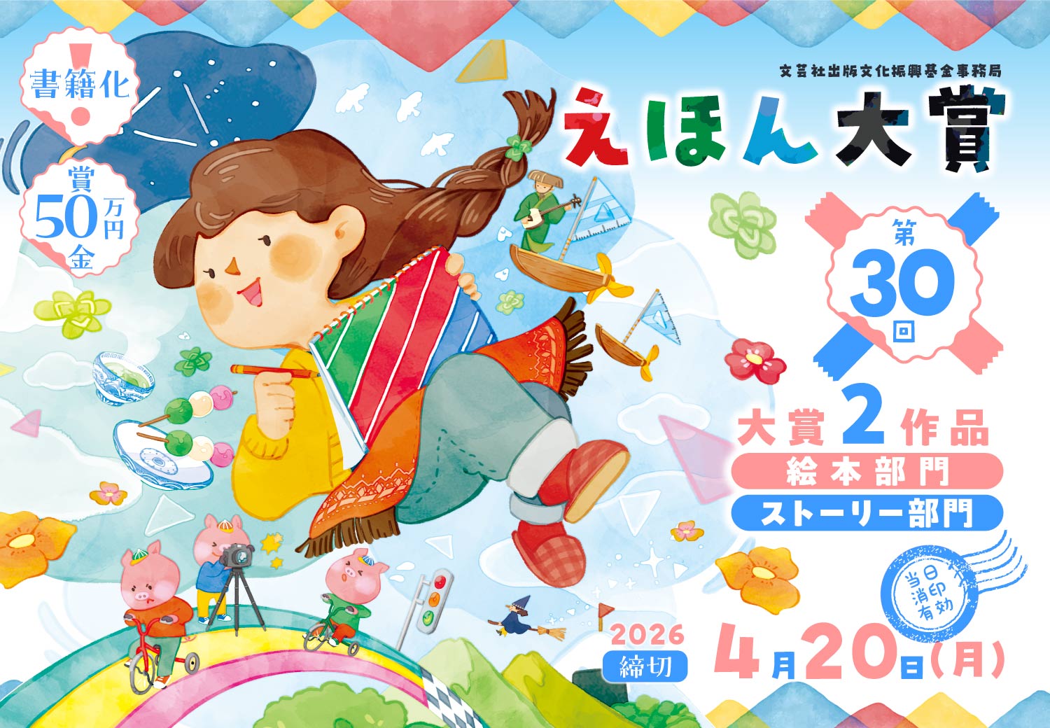 第30回えほん大賞 | コンテスト | 文芸社絵が描けなくても応募できる!受賞できる!第30回えほん大賞は絵本部門とストーリー部門の2部門で作品を受け付けています。各部門大賞受賞作は、書籍化し全国出版&賞金50万円。応募期間は4/20まで。奮ってご応募ください!• ◆大 賞